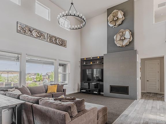 A rare fusion of modern architecture and timeless elegance, this impressive home stands proudly on a third of an acre corner lot in the coveted Whispering Pines community. The striking stone-and-siding façade and clean contemporary lines set the tone for what lies within—a bold, sophisticated residence designed for elevated living and unforgettable entertaining. Step inside to a grand sense of arrival. The modern staircase with sleek cable railing rises alongside soaring ceilings, introducing a home filled with architectural interest and flooded with natural light. Wide-plank wood-style floors span both the main and upper levels, creating visual continuity and understated luxury throughout. A dramatic two-story great room delivers the home’s defining moment framing panoramic mountain views through expansive glass and anchored by a sleek linear fireplace set against large format tile. The adjoining kitchen is a showpiece with flat-panel cabinetry, granite island seating for six, dual ovens, gas range, and a walk-in pantry—all illuminated by designer pendant lighting. The dining room wraps you in natural light and flows effortlessly to a covered patio with a bubbling hot tub, perfect for year-round enjoyment. A stylish main-level lounge currently functions as a wine and game room, but easily transitions to an office or den. A private guest suite with full bath completes the main level. Upstairs, the expansive and tranquil primary suite captures Front Range views and features a spa-inspired bath with a free standing soaking tub, oversized glass shower, dual vanities, and dual walk-in closets. Two additional en-suite bedrooms and a versatile loft provide space for all. The 2,200-sq-ft unfinished basement with 10-ft ceilings invites your custom vision. Enjoy access to Whispering Pines amenities including a clubhouse, pool, playgrounds, and trails—all just minutes from the Aurora Reservoir, Southlands Mall, Cherry Creek Schools, DTC, and DIA.