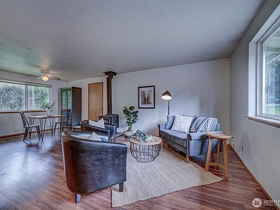 Discover this charming and cozy 2-bed, 1-bath home in Miller Bay Estates! This home features fresh interior paint, updated flooring, and a newer wood stove and front deck. The inviting living room flows seamlessly into the kitchen and dining areas. Both bedrooms offer comfort and share a full bath. The backyard provides a perfect space for relaxation, hobbies, or entertaining, while the single-car garage offers additional storage or parking. Enjoy fantastic community amenities, including waterfront access, a clubhouse, a playground, a basketball court, and a seasonal outdoor pool. Conveniently located near Poulsbo and Kingston, this home offers an easy commute to Naval Base Kitsap and ferry access to Edmonds and Seattle.