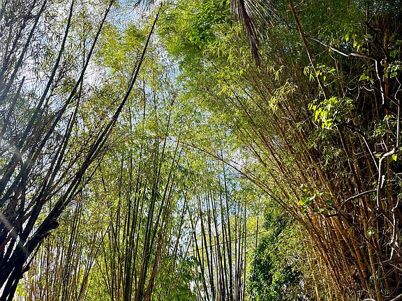 Perched on over 2.2 lush acres, this expansive property boasts panoramic ocean and sunset views. Access parcel through a stunning bamboo archway before arriving at gated entry.