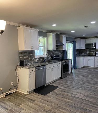 This 3 bedroom home with 2 bathrooms features an updated kitchen with granite countertops and all stainless steel appliances, fireplace in the living room, the bedrooms have carpet and the kitchen, dining and living area have new floors.