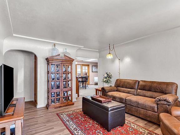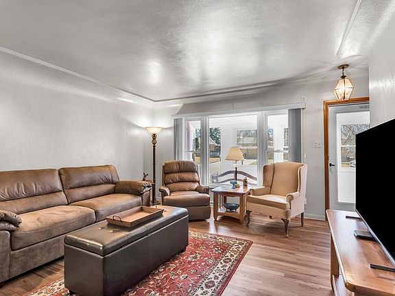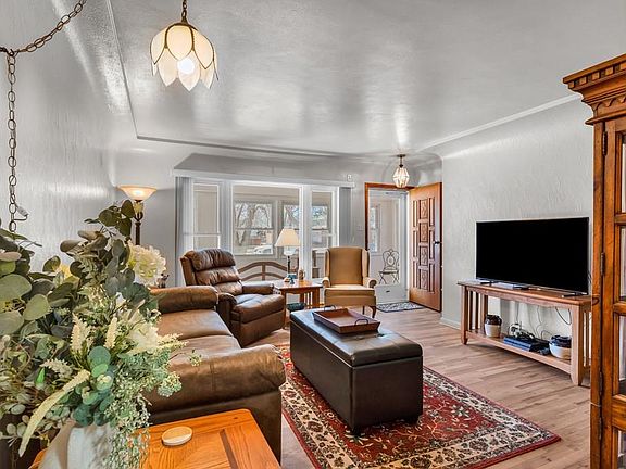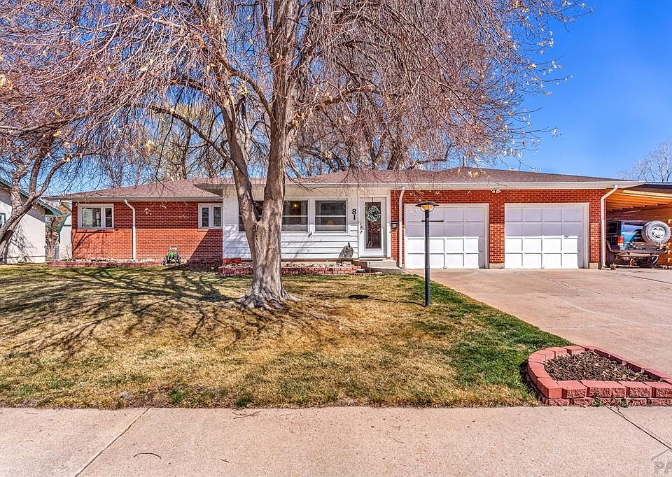 Spacious 3-bedroom, 3-bath brick home with an attached 2-car garage and a 1-car carport. The front yard is landscaped with a lush lawn, a sprinkler system, and a mature shade tree. An enclosed front porch leads into the living room, which features hardwood flooring. The dining area has tile floors, a wood-burning fireplace, and a skylight for extra natural light. The updated dine-in kitchen includes breakfast bar seating, ample cabinet space, tile flooring, and another skylight. A half bath is conveniently located for guests. All three bedrooms are on the main level and have hardwood flooring. The laundry room features tile flooring and a mud sink. The primary suite adjacent bathroom includes a walk-in shower and a jetted tub. Step down from the dining area into the spacious family room with backyard access to a covered deck—perfect for outdoor enjoyment. The basement offers additional living space with a bar area and a bathroom. The fully fenced backyard includes a lawn, sprinkler system, mature tree, and a storage shed/workshop.