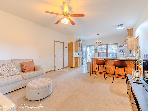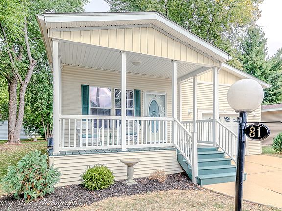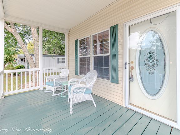 Discover affordable living without sacrificing comfort in this highly sought-after 55 and older community! This well-maintained 3-bedroom, 1-bath home welcomes you with a charming, oversized front porch-perfect for relaxing and enjoying conversations with neighbors. Step inside to an inviting layout featuring a beautifully updated bathroom with a walk-in ceramic tile shower, new Kohler fixtures, and a modern vanity. The soaring 9-foot ceilings, open floor plan, and abundance of windows make this home light, bright, and airy. All appliances are included, and the furnishings are also available, making this home truly move-in ready. The vinyl exterior ensures low-maintenance living, and the attached 1.5-car garage provides generous storage with custom multi-level shelving. An additional 8x10 shed adds even more space for tools, hobbies, or seasonal items. Recent updates include: furnace (2023), Hot Water Heater (2023), Solid Surface Countertops, Kitchen Sink, and Dishwasher (2024).