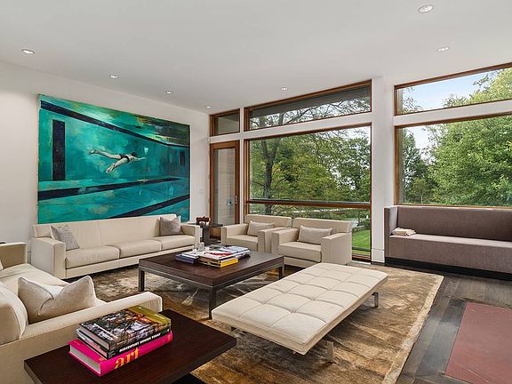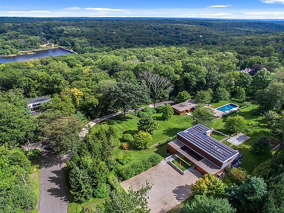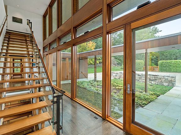 PLEASE CALL LISTING AGENT HANNELORE 914-450-3880 TO TOUR Elliot Noyes Mid-Century Modern transformed and reimagined for 21st century living by architect Joeb Moore. Spectacular light and airy, solar-powered main residence, located high on private, gated 2.8 acres with seasonal views of reservoir, features walls of glass, a floating staircase joining all three levels, and natural wood and stone elements. Separate pool house and newer guest house, self-contained w/ kitchen, bedroom, living room & den, located aside heated gunite pool/spa. 2-car garage in main residence and 3-car garage in guest house. Magical living experience in this artistic integration of space, form, light & function, all in harmony with nature. Every room enjoys breathtaking views of property, landscaped/hardscaped by Reed Hilderbrand, with mature plantings, water features & stone walls. 2019 new solar panels installed in main house result minimal cost to run. All 3 structures main house, pool house and guest house have new roofs installed in 2018.