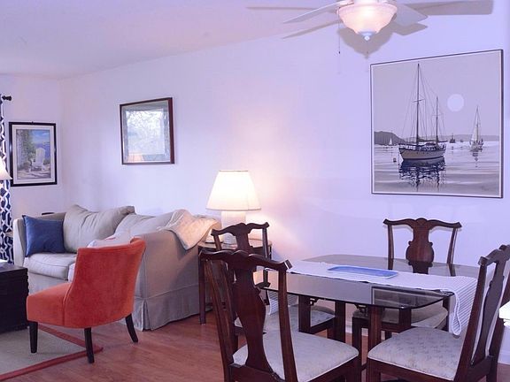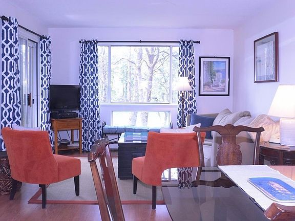 Park your car, and head right in to this lovely, freshly decorated and fully furnished one bedroom one bath condo set amid the beautiful landscaping of the Ocean Edge community. Easily accessible, there are no stairs and no shared corridors in this pretty unit that overlooks woods and golf course from both bedroom and living room. Sliders from each room open onto a private balcony. New granite counters enhance the kitchen which has a stack-able washer/dryer, and new wood floors to give the whole unit a pretty, unified feeling, relating the dining and seating areas. The tastefully furnished living room has a pull-out sofa to accommodate overnight guests. No amenity package is necessary to enjoy the walking paths, the bike trails, or the shuttle to the mansion for additional restaurants and bars.