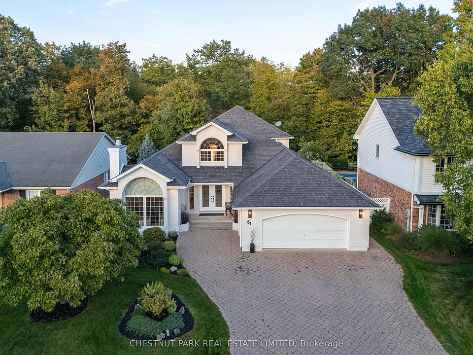 A Rare Ravine lot, custom home in Erion Estates, surrounded by mature trees. This bungaloft feels private, peaceful, and grand all at once. From the moment you walk through the front door, the home opens up with 2-story ceilings, large windows, and an abundance of natural light. Designed for easy main-floor living, the layout flows effortlessly with everything you need on one level. The spacious kitchen sits at the back of the home overlooking the ravine, offering a large island and a dining nook surrounded by views of your oasis yard. The family room feels open and inviting with double-height windows framing the treetops with a gas fireplace and has direct access to backyard patio through the siding door. The main floor primary suite is a true retreat featuring two walk-in closets and a generous ensuite with double sinks, a jetted tub, and shower. You also find a formal dining area, a bright living room with a wood-burning fireplace, main floor laundry with access to the double-wide heated garage, and a powder room for guests. Upstairs overlooks both the foyer and family room, along with two additional bedrooms and a full bathroom. The basement is partly finished with just under 8-foot ceilings. There is an additional bedroom with two walk-in closets and a spacious connected lounge space. Rough-in plumbing is also in place in the basement if you wish to add an additional washroom or kitchen to create separate living accommodations. The backyard oasis is what truly sets this property apart with the lush, private ravine setting and established gardens with an irrigation system to keep it looking its best year-round. Homes like this, combining a ravine lot, timeless design, and a main-floor lifestyle, rarely come to market in Erion Estates.