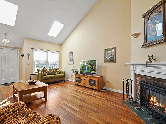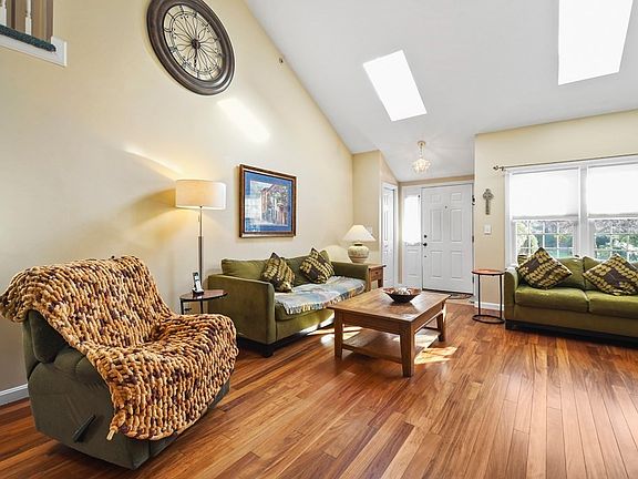 Welcome to this charming townhouse located in the sought-after Harrington Farms Complex! Upon entering you will be greeted by a spacious living rm w/ cathedral ceilings, gleaming HW floors, skylights, & a cozy fireplace! The open dining rm, also featuring a skylight & HW floors, seamlessly flows into the kitchen which boasts a delightful breakfast nook, beautiful white cabinets, S/S appliances, & sliders leading to the back deck, providing a lovely space for outdoor dining. Convenience meets functionality with a 1st floor in-unit laundry. Ascending to the 2nd level, you will discover a main bedroom w/ an en suite bath & HW floors! A 2nd full bath & an additional bedroom complete the upper level! This home is not only aesthetically pleasing but also well-maintained, w/ a newer roof, & furnace and central air updated in 2016. The association pet friendly, offers many amenities including a pool, tennis courts, clubhouse, & has recently repaved the street, sidewalks, & driveway in 2023.