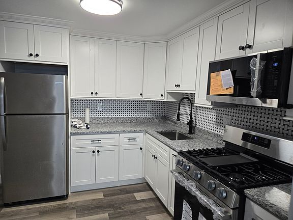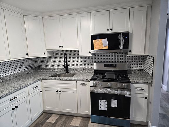 Presenting a pristine kitchen, complete with new cabinetry w/crown molding, upgraded counters w/a single-bowl sink, tiled backsplash, SS appliances and modern plank flooring, you'll delight in making full use of this space.