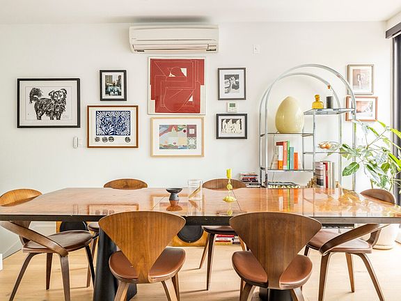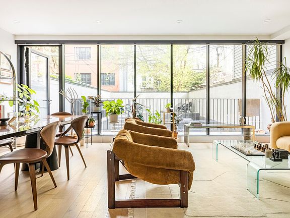 Welcome to India Place, a 2-bedroom, 2.5-bathroom duplex in Greenpoint. This 2,000 square-foot home offers flexible living across two levels with rare private outdoor space, hardwood floors, and modern finishes throughout. Meticulously furnished with some of the rarest mid-century, 70s Italian, and brutalist pieces, this home blends style and comfort in every corner. The main floor features an open living and dining area with a curved glass wall that fills the space with natural light and garden views. A modern kitchen with stainless steel appliances, quartz countertops, and two-tone cabinetry makes cooking easy. The en-suite primary bedroom includes double closets and a bathroom with a soaking tub. A guest bathroom and direct access to the first private terrace complete this level.