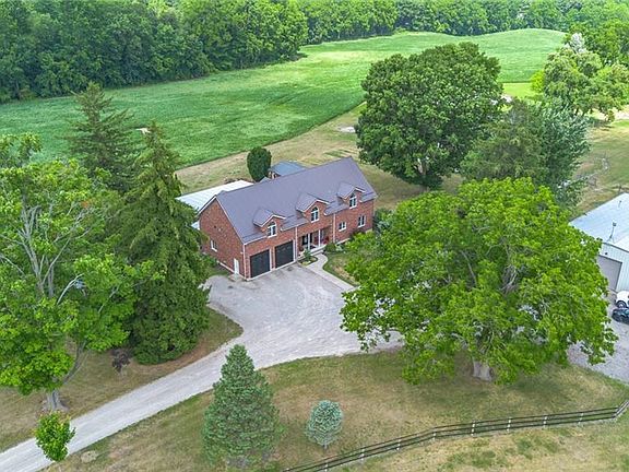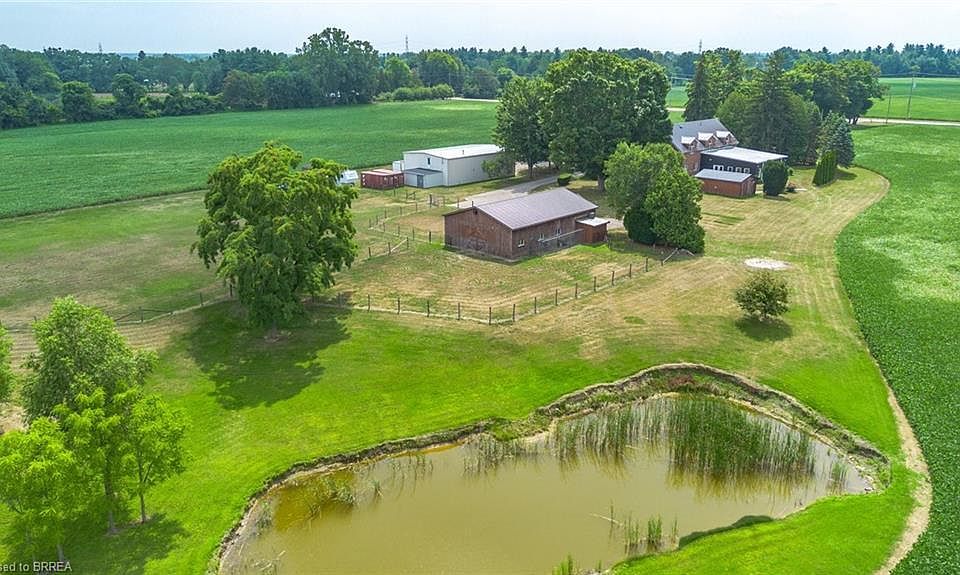 An exceptional farm located on prime agricultural land of 53 acres in the County of Brant. The 2001 Red Brick two story home is move in ready and shows beautifully. Updated with new kitchen (2018),upper floor baths ( 2017), basement bath (2024), upper hardwood floors (2019), roof (steel) furnace and air ( 2019), owned hot water tank ( 2021), well 2008. Main floor is open concept great room /dining and kitchen with pot lights, upgraded stainless appliances, counters, island and double sink. hardwood and tile floors, high ceilings, big windows , gas fireplace, french doors to deck. 2pc bath on this floor and storage pantry. Double closets. Entrance to double garage. Grand stair case to upper floor where you will love the huge family room with gas fireplace and entertainment centre, tucked away laundry area, room for card table and office area in this big room with vaulted ceilings.. Three spacious bedrooms. Primary with walk in closet and lovely four piece ensuite. 4pc family bath. Round top windows throughout his level that allow wonderful views ! recreation room, 3pc bath and fourth bedroom in basement. Lots of storage. A completely self contained addition contains a gorgeous inground saltwater pool room with stamped concrete heated floors, windows all the way around, french doors , vaulted ceilings and top of the line HRV system which prevents any condensation and keeps the temperature even. What a great exercise option, family gatherings, pool parties and just to enjoy being in a resort like atmosphere at your own home. Separate 60 x 40' steel workshop with second floor office. Air conditioned and cooled. Two piece bath. 33 x 32' building can be utilized as a guest cottage, second family living, permitted for store or office , has tall ceilings, white washed walls and 2pc bath ( easy to ad a shower..) this building has its own furnace with air. and its own septic.. Small finished building for exercise or office. Pond and fenced paddocks. Three box stalls.
