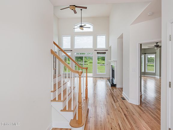 Lovely contemporary home on 5.05 acres with gorgeous 360 views. Sunrise to sunset bright natural light throughout home. Great room features a wall of windows with a cathedral ceiling, will flood the room with natural light. Gas fireplace is oversized in Great room with granite surrounds and built ins.Hugh eat in kitchen with oak traditional cabinets and oversized island for extra counter space. Sparkling oak hardwood floors on the 1st floor. Spacious 1st floor primary suite with bay windows. 2nd floor features 3 bedrooms with one being extra large over the garage. There is a nature trail filled with wildflowers. A workshop is located in the basement. Year old Weber BBQ with separate gas line, can remain. This beautiful home will provide you with years of enjoyment.