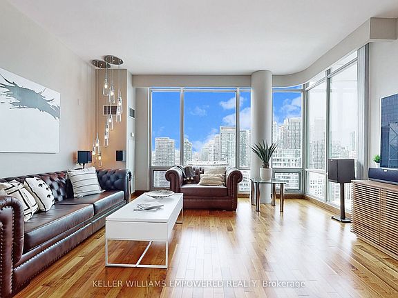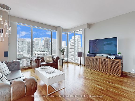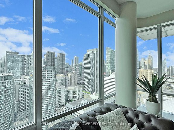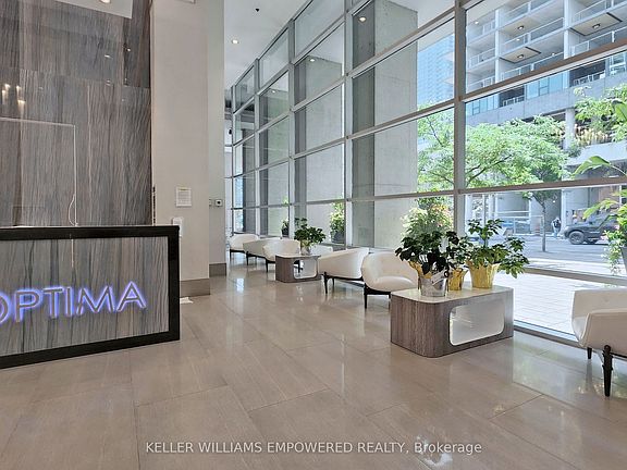 Optima Condos offer an unbeatable location in Torontos Waterfront Communities! Steps to the Entertainment District, Harbourfront, Rogers Centre, CN Tower & Scotiabank Arena. With a 95 Walk Score and multiple transit options nearby, convenience is unmatched. Only 5 minutes to The Well - Toronto's premier destination for luxury shopping, dining, offices & entertainment. This executive, fully furnished penthouse corner suite features 1,310 sq. ft. of interior space, nearly 10 ft. ceilings, and a large private balcony. Floor-to-ceiling windows flood the unit with natural light and showcase panoramic city & lake views. High-end finishes throughout: Viking & Miele S/S appliances, 65" Panasonic TV with Dolby 7.1 Surround Sound, and custom built-in cabinetry. The second bedroom includes a queen bed that converts into a large office desk, offering flexibility for executive living. Incredible building amenities with recent upgrades throughout, including 24/7 concierge, swimming pool, hot tub, sauna, fitness centre, outdoor lounge deck with BBQs, party room and visitor parking.