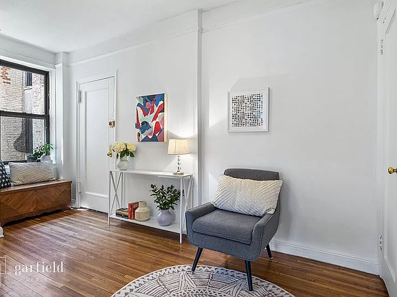 Thoughtfully designed and well proportioned, this comfortable and airy oasis boasts multiple corner windows and a flexible layout. A spacious entry foyer leads to the large living room and dining area. A corner-windowed eat-in-kitchen offers abundant storage and stainless-steel appliances. The tranquil bedroom is currently sub-divided into two functional bedrooms. The windowed bathroom is renovated with subway tiles and tasteful finishes. Additional features include lovely art deco details, archways, parquet floors, high ceilings, and great closet space. Situated in a pet-friendly building with a courtyard, on-site super, private storage, bike room, central laundry and a common garden with individual gardening plots for shareholders to enjoy.