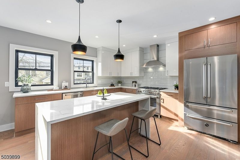 MODERN MASTERPIECE in the heart of Downtown Millburn. Close to parks, shops, schools, AND commute. Looking for convenience and space? Your 2021 home match has arrived. Equipped w/ 5 bedrooms, Flex Office Space, and 5 full baths, first floor open concept for interactive dining or unwinding, fresh and modern finishes, & ample outdoor space for all to enjoy. Chef's gourmet custom kitchen with Bertazzoni appliances, waterfall center island overlooks the dining area adjoined by living space & opens to a covered patio for grilling. Office/Bedroom complete the first level. Master suite w/ walk-in closet & oversized shower & two bedrooms w/ balconies share a hall bath. 3rd level w/ en-suite bedrm, laundry rm, & roof top terrace w/ gas connection. Basement rec room, full bath & mudroom