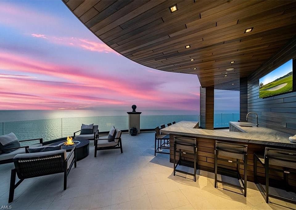 Welcome to the Ultimate Sky Mansion at The Seasons at Naples Cay. Step into a world of unparalleled sophistication and exclusivity with this one-of-a-kind penthouse mansion, perched atop the prestigious Seasons at Naples Cay. Situated in one of Naples’ most coveted beachfront enclaves, this singular residence offers an extraordinary opportunity to own a monumental piece of architecture and design. Meticulously reimagined by the visionary team at C&E Builders and celebrated designer Ruta Menaghlazi of Theory Design, this 11,000+ square-foot masterpiece under air redefines luxury living, showcasing finishes and craftsmanship that are truly without equal. From the moment you enter, the grandeur of this residence is unmistakable. The entryway sets the tone with soaring ceilings and an immediate sense of scale, leading to expansive living spaces designed to entertain and inspire. Every detail has been carefully curated, from the champagne eucalyptus cabinetry with reeded glass and white Macaubas countertops in the gourmet kitchen to the gas range and top-tier Miele appliances that elevate culinary experiences. The home includes five opulent ensuite bedrooms, a dedicated study, and wine bar, each space exuding sophistication and thoughtful design. Floor-to-ceiling windows frame breathtaking 360-degree views of Naples, the Gulf of Mexico, and the sparkling Bay, creating a daily spectacle of stunning sunrises and sunsets. Encircling the penthouse is an expansive 4,843 square feet of terrace space designed to maximize outdoor living. This includes a Gulf-view kitchen and dining area, as well as multiple seating spaces perfect for hosting gatherings or enjoying serene moments of relaxation. The primary suite serves as a private sanctuary, complete with a spacious deck overlooking the Gulf, a spa-like ensuite featuring dual vanities, tranquil soaking tub, and separate his-and-her quarters.The home seamlessly blends form and function with unique features such as back-lit onyx entertainment and wine bars, a temperature-controlled wine display room, herringbone oak flooring, and three custom fireplaces adorned with rare materials. Indulgent amenities include a spa treatment room with a sauna, fitness center, and a walk-in wine cellar, offering unparalleled resort-style living. Located just steps from the pristine white sands of the Gulf and minutes from the upscale shopping and dining of Venetian Village and Waterside Shops, this penthouse offers an unmatched lifestyle of convenience and luxury with the management team bringing a level of service and discretion that one would expect only in the finest of residences, ensuring that every need is met with the utmost care. It is not merely a home but a statement—the pinnacle of elegance, exclusivity, and sophistication. As the only penthouse mansion of its kind, this residence redefines luxury living in Naples. Welcome to your mansion in the sky.