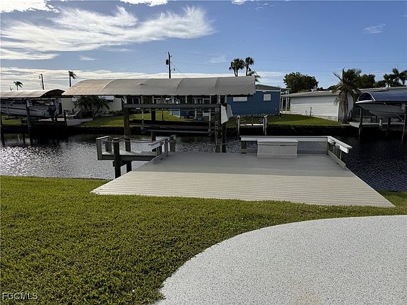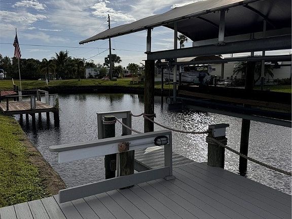 Retirement living in paradise just got a whole lot better! This lovely 2 bed/2 bath waterfront home with its comforting water view from its 200 sq ft attached lanai and right outside the back door a large composite deck with its covered boat lift offers direct access to the Orange and Caloosahatchee Rivers where one can enjoy many hours of boating, fishing and sunset views. The monthly maintenance fee of $407 includes water/sewer, trash, lawn care, fiber optics internet, and all the amenities of the community including heated pool, large clubhouse, two boat ramps, a community fishing pier, pickleball courts, shuffleboard and so much more! The community allows for up to two pets. Some dog breeds are not allowed, so be sure to review the rules. ESA animals are allowed. Price includes share for the lot and ownership in the community