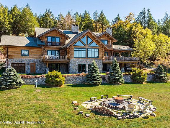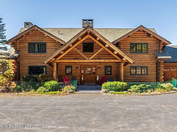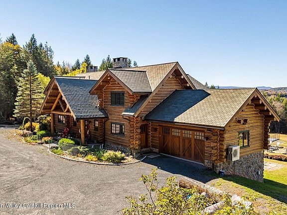 Secluded Mountain Estate with 20+ Acres, Panoramic Views & Sport Court in Windham, NY. Privately gated at the very end of Sundance Drive, this extraordinary log estate is one of only five luxury homes in this sought-after enclave each on expansive land, but none offering the privacy, scale, or setting of this one. Set on a sweeping tract with panoramic mountain views, this home blends refined craftsmanship with rustic elegance in a way few properties ever do. Inside, you're welcomed by soaring vaulted ceilings clad in pine, wide-plank cherry-stained wood floors, and custom finishes throughout. The open-concept layout centers around a jaw-dropping great room with a two-story wall of glass and a dramatic stone fireplace. From there, the space flows seamlessly into a chef's kitchen outfitted with commercial-grade stainless steel appliances, dual dishwashers, copper farmhouse sinks, stone countertops, and handcrafted copper lighting that echoes throughout the home. Multiple French doors open to a wraparound deck designed for all-season use, complete with an outdoor fireplace and a covered, wired section ideal for enjoying snowfall or rain in comfort. With six spacious bedrooms, several featuring fireplaces and balconies, the home is made for hosting or relaxing in peace. The primary suite includes custom built-ins, a fireplace, and a spa-style bathroom with forest and mountain views. The main level also offers a dedicated office and ski/boot room. Throughout the home, you'll find a rich mix of wide-plank wood, slate, and bluestone flooring, adding to the upscale mountain lodge aesthetic. The finished walkout level expands your living space significantly with additional bedrooms and bathrooms, a beautifully designed wet bar with copper accents and a third dishwasher, and a wine and cigar room. A dual-sided fireplace connects the large family room with a card/game area, and a fitness center is discreetly tucked off to the side. A second laundry area here complements the one on the main floor for added convenience. No detail was overlooked in construction or design. The home includes full surround sound, air conditioning, a whole-house generator, 8-year-old composite slate replica roof with 50-year warranty, composite decking, and both attached and detached garage spaces. The grounds are just as spectacular as the interior. Professionally landscaped with stone walls, walkways, and mature gardens, the property also features a fire pit gathering area, a full-size sport court with basketball and tennis setup, and acres of manicured lawn and private woods perfect for hiking or quiet exploration. This is a once-in-a-lifetime opportunity to own a private mountain estate less than 1.5 miles from town and just 2 miles from Windham Mountain Ski Resort. Designed for comfort, built for generations, and surrounded by nature, this is more than a home, it's a legacy property.