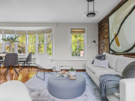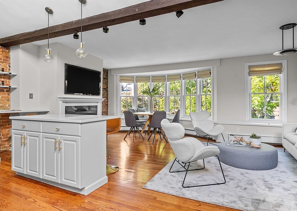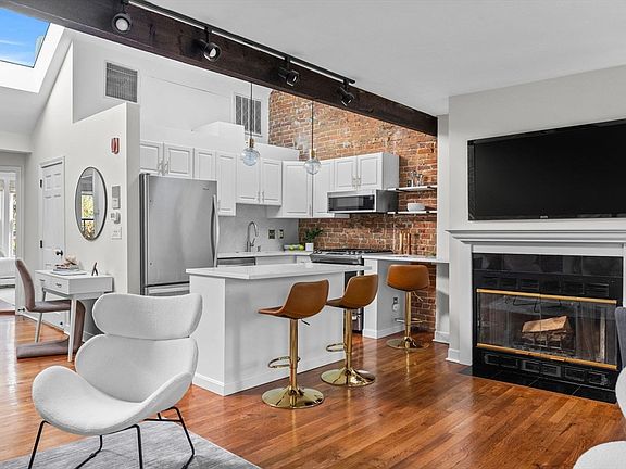 Beautifully renovated penthouse jewel box in the heart of the South End. Set on Boston Magazine’s “Best Street” in the coveted Eight Streets neighborhood, this top-floor 2-bedroom blends historic charm with modern updates throughout. Vaulted ceilings, exposed brick, skylights, and the most charming bow window create warmth and character. A sun-splashed living/dining area is centered on a wood-burning FP and opens to the kitchen, equipped with quartz counters, stainless appliances, gas cooking, and a center island with bar seating. Two serene bedrooms, including a sunny primary with three large windows with tree-top views, offer ample storage. A stylish Carrara marble bathroom features a tub with glass enclosure and in-unit laundry. Full staircase leads to a large private roof deck with sweeping skyline views—perfect for entertaining. Additional features include hardwood floors and newer central AC. Well-run 6-unit association with many updates. Truly A++ location that checks every box!