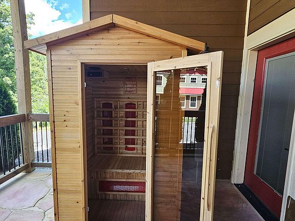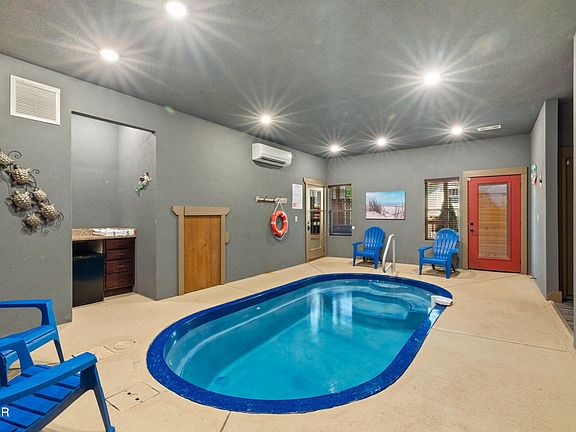 The main-level primary suite offers a true spa escape with its own double-sided fireplace and a large jetted tub with a relaxing view of the fire. Upstairs offers a game loft with pool table, air hockey, arcade game, and two more bedrooms each with their own en-suite baths. Downstairs, the real magic begins — your guests will love the heated indoor pool, private home theater with tiered seating, dry sauna, and a private en-suite king bedroom for extra guest comfort and privacy. A half bath, microwave, and mini-fridge add convenience, and just outside is a bubbling hot tub for soaking under the stars.