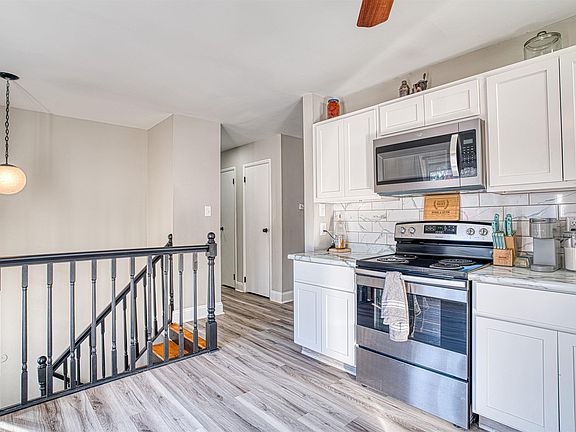 Beautifully remodeled bi-level home in the desirable Carriage Hill neighborhood! This home features 3 bedrooms on the main level and 1 additional bedroom on the lower level, along with a total of 2 full baths. Situated on a spacious lot, the main floor includes a bright living room and a large eat-in kitchen with access to the 14 x 12 deck overlooking the fenced in backyard, ideal for outdoor grilling and relaxing. The lower level offers a cozy family room with built-ins, plus a bedroom, a large unfinished storage room, and a laundry area. Plenty of off street parking with the oversized driveway. Replacement windows, newer roof and detached extra large 1.5 car garage. Nestled on a quiet cul-de-sac, the home is conveniently located near excellent schools and shopping.