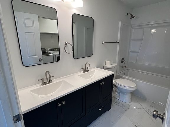 The remodeled bathroom includes double vanity, Large capacity washer/Dryer and a comfortable shower.