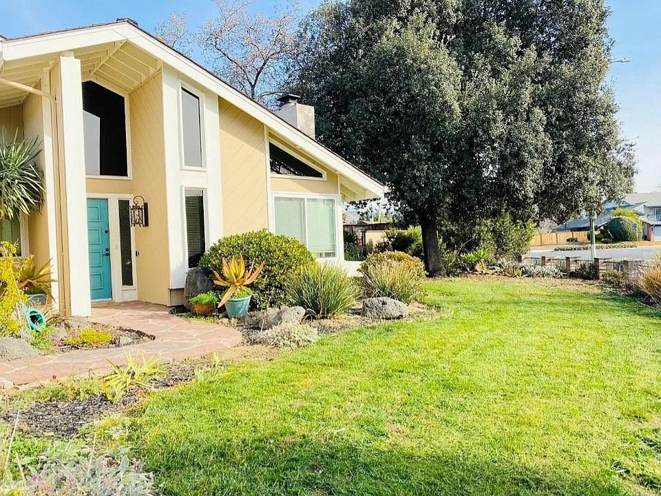 Outdoor spaces include both front and back lawns, a lush garden, and multiple areas to relax and enjoy the California sunshine.