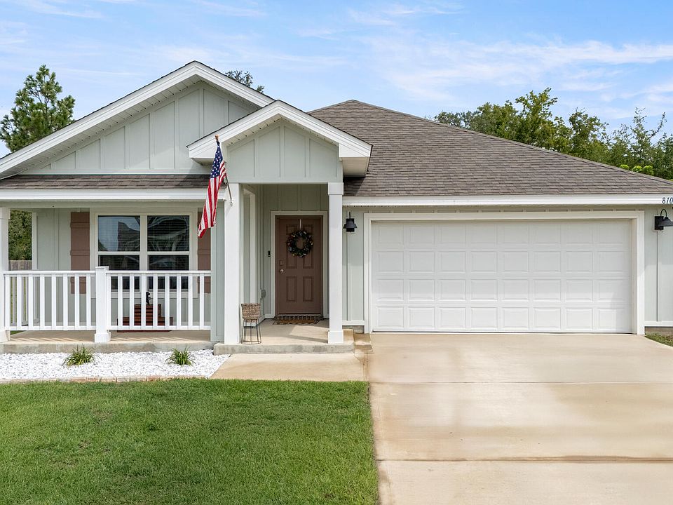 THIS WILL BE A SHORT SALE. Welcome to Shoal River Landing! This well-cared-for Cali floorplan offers 4 bedrooms, 2 bathrooms, and 1,775 sq ft of comfortable living, paired with thoughtful details that set it apart.From the curb, you'll notice what makes this home unique, a covered front porch with classic railing, rarely found in this model, adding charm and inviting curb appeal. Inside, the open layout connects the living, dining, and kitchen spaces seamlessly. The kitchen features a large granite island with seating, stainless steel appliances, and crisp white cabinetry, highlighted by a bold blue accent island that adds personality to the space. The living room continues the theme with a matching feature wall designed for your entertainment setup.The split bedroom design gives privacy to the spacious primary suite, complete with a double vanity, walk-in shower, soaking tub, and walk-in closet. Three additional bedrooms and a full bathroom offer flexibility for family, guests, or a home office.