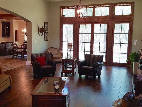 17 acres and a beautiful 4/3 custom home with many nice features & upgrades. Granite counters, hardwood & tile floors, open kitchen with island/bar, dual convection ovens, Viking cooktop, prep sink, and a walk-in pantry. 12' high ceilings and a large stone fireplace in the living area. The laundry room has a sink and space for a 2nd refrigerator. Oversized 2C garage, plus a detached 20' * 22' workshop/tackroom. Sandy soil, ag exemption, private water well with a 10' * 12' well house and filtration system, round pen, and more. Nice mixture of woods and pasture. Gated community, fiber high speed internet, short distance to town and shopping. This one is a must see!