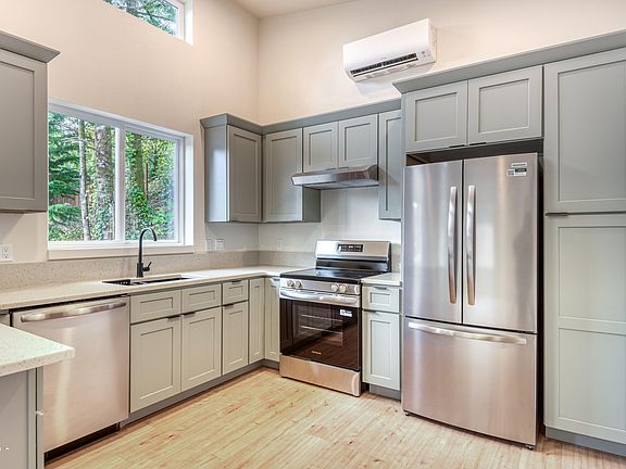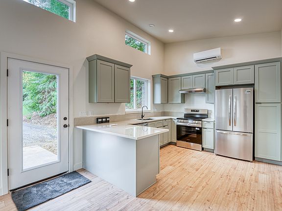Sage green cabinetsLarge patioTankless water heaterDuctless heat pumpLots of natural lightMetal roofQuartz counters
