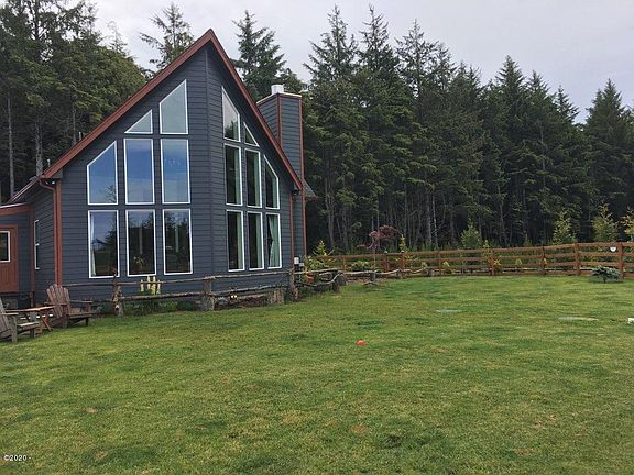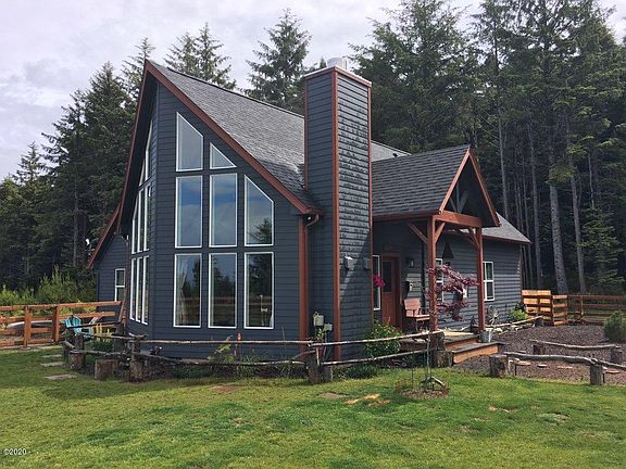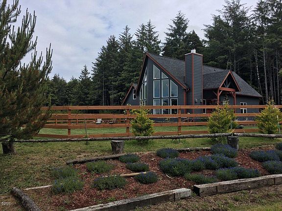 Price reduced again, bring all offers. Custom built home on nearly an acre, backing up to forest, with distant ocean views and great sunsets. End of the road privacy! Beautiful custom touches throughout the home, including authentic barn wood wrapped beams, window sills and trim. Claw foot tub in master bath. Fireplace in living room, next to wall of windows. 2nd floor loft overlooks living area, with ocean view. 3rd bedroom and bathroom upstairs. Custom dog kennel, with plumbed hot/cold water for washing. Must see this home!