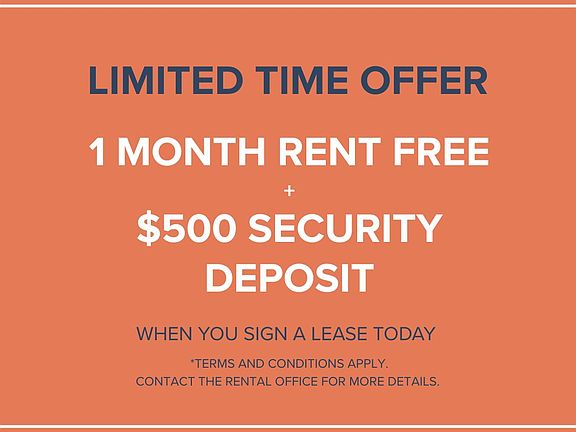 - Special offer! 1 Month Rent Free + $500 Security Deposit - Move in this month and you may qualify for our incentive.