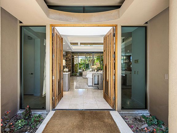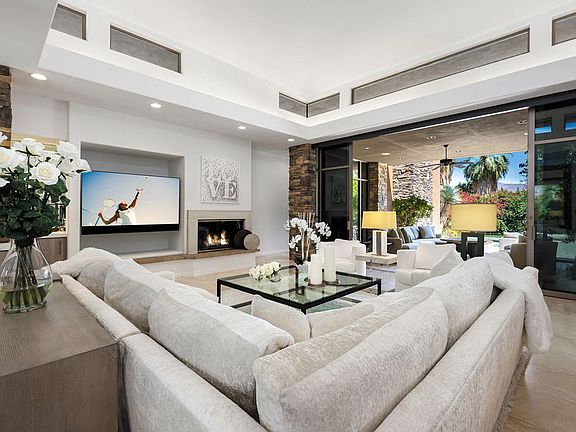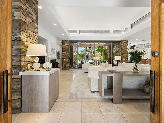 Custom gates welcome you into this inviting Entry Courtyard with hand-crafted water feature, tropical landscaping and seating area. Vaulted ceilings with clerestory windows, built-in media center and stone fireplace are featured in Great Room; corner wet bar with custom-faced refrigerator make for easy entertaining; electronic drapes, glass sliders leading to covered outdoor living room with waterfall and lushly landscaped viewsCozy Dining area adjacent to open-concept great room and kitchen, surrounded by floor-to-ceiling windows overlooking entertainment patioBright and light breakfast bar with quartz countertops, custom cabinetry and seating for four in Kitchen, upgraded high-performance appliances including 4-burner Viking gas range, dishwasher, double ovens, Sub-Zero refrigerator, wine refrigerator and message centerA very private, multi-tiered Entertainment Patio provides ample entertaining opportunities, with covered outdoor living room with firepit lounge, barbecue center, pool, spa and relaxing waterfall views, with your own lakeMaster Suite has inviting Travertine fireplace and seating area, and private patio with waterfall views; Skylights bring the outside in to the Master Bath, which features a spa tub, dual sinks and vanities, lavs and walk-in closetsPrivate Guest House with fireplace, morning bar and full bath; two interior Guest Suites with private entry and full baths