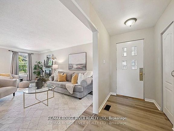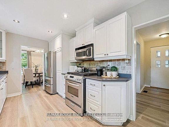 Offers anytime! Spacious, sun-filled 3-level Back-Split home nestled in South Pickering's Bay Ridges by the Lake. Open concept main floor features a living room, dining room and updated kitchen. Walk out from the kitchen to the private patio and deck. The large backyard is surrounded by mature trees and has a side drive in gate that has a driveway cut out. Finished basement with gas fireplace. Updates to this home include new luxury vinyl plank floors on the main and second floor(2025), new carpet in basement (2025), freshly painted though out (2025), new 100 amp electrical panel (2025). Steel roof. The home also features a private driveway and a carport/garage that is heated. Walking distance to Schools, Pickering's Beachfront Park & Millennium Square, the beach, the marina, the waterfront trail, trendy waterfront shops, restaurants, and the GO train. Quick access to Hwy 401. New AC July 2025.