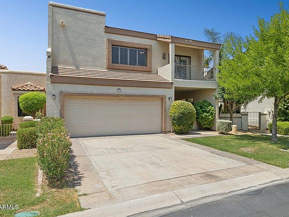 Welcome to this beautifully maintained two-story property located in the exclusive guard-gated community of Cameldale, nestled in the heart of Scottsdale. This 3-bedroom, 2.5-bathroom residence offers the perfect balance of privacy, comfort, and amenities. Step into a bright and airy open-concept living space featuring coffered ceilings, a cozy fireplace, and expansive windows that flood the home with natural light. The spacious living and dining areas flow effortlessly, ideal for entertaining or quiet evenings at home. The kitchen is equipped with recently replaced/installed stainless steel appliances, beautiful cabinetry, granite countertops, opening to a charming breakfast nook with access to your private patio. Upstairs, the luxurious primary suite boasts vaulted ceilings, a walk-in closet, and a spa-inspired bathroom with dual sinks and a walk-in shower. Two additional bedrooms offer ample space for guests, home office, or flex use, complemented by a full guest bathroom and a convenient powder room on the main floor. Enjoy Arizona living with access to community amenities including two sparkling pools, relaxing spas, and lighted tennis/pickleball courts, all surrounded by lush landscaping and scenic walking paths. Located just moments from Old Town Scottsdale, premier golf courses, world-class shopping, fine dining, and cultural attractions, this home offers an unbeatable combination of security, serenity, and convenience. Recent Updates: interior paint, new carpet upstairs, roof maintenance & toilets: July 2025.