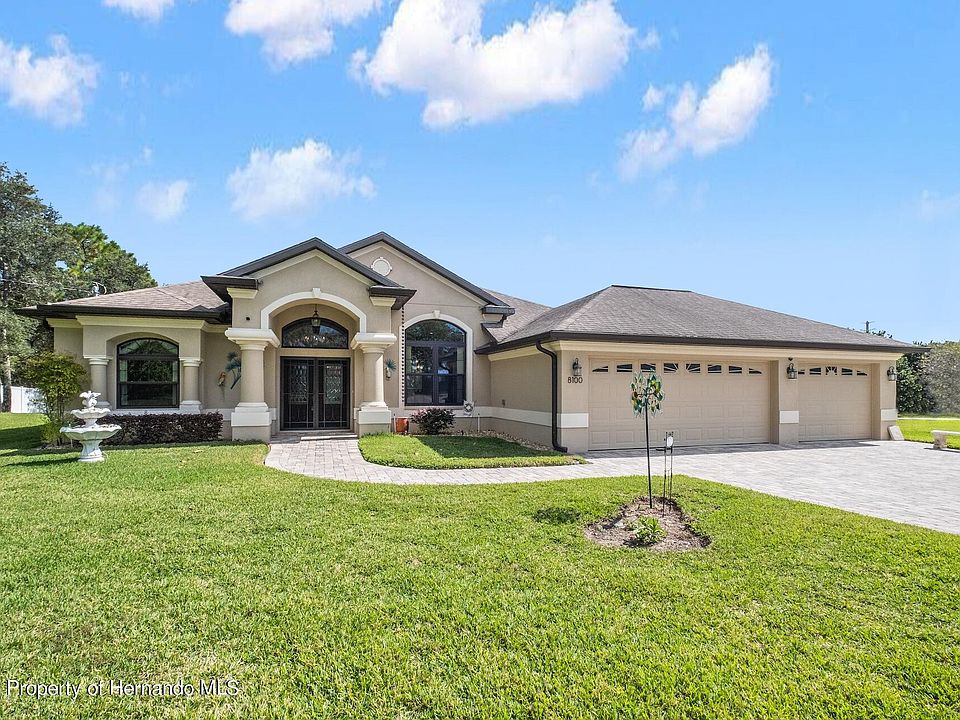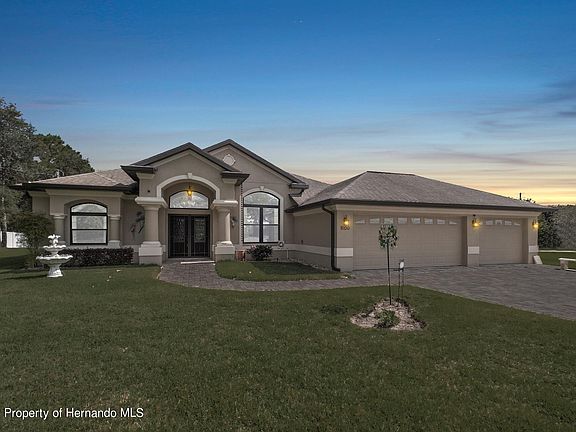 Active Under Contract - Accepting Back Up Offers. Welcome to a meticulously crafted custom home, built in 2016 and cherished by its original owner. Conveniently situated near all essentials, it offers the tranquility of a one-acre manicured lot together with no rear neighbors. This residence boasts three bedrooms with plenty of space, alongside a substantial office adorned with custom built-ins, versatile enough to serve as a fourth bedroom if desired. With 10-foot ceilings, the home exudes an open as well as airy feel, enhanced by the custom crown molding that graces every room. The guest bedrooms and office feature built-in window seats, inviting you to relax with a good book or enjoy the outside view. Abundant natural light fills the house, creating a bright as well as welcoming ambiance. The master bedroom is a grand retreat with ample space, including a lovely sitting area for moments of relaxation. The master bathroom offers a luxurious experience with both a deep soaking tub and an expansive walk-in shower. Throughout the house, granite countertops add a touch of sophistication and durability. Step out to the large pavered lanai, a space that offers privacy and the perfect setting for outdoor gatherings or quiet moments of reflection. The property features an extended, wide paver driveway and 5-foot wide pavered sidewalks, providing both curb appeal and convenience. With both a spacious three-car garage attached to the home and a detached garage ''man cave''. This property caters to all your storage and hobby needs. This is not just a house; it's a place where thoughtful design, meticulous care, and an abundance of features come together to create a truly exceptional living experience.