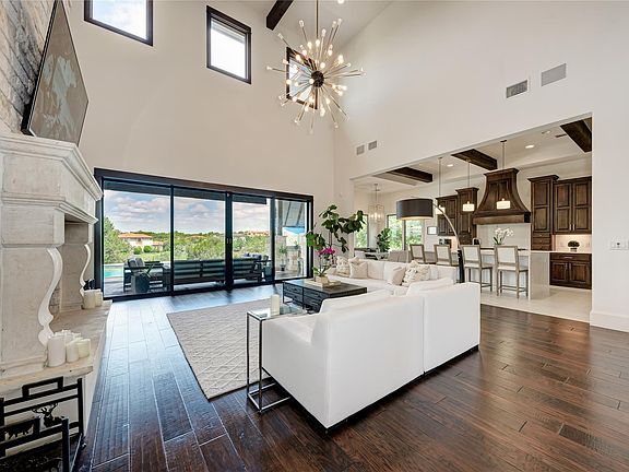 LIMITED-TIME OFFER: Seller will contribute up to $50,000 buydown or closing costs + 1-year HOA/Tax credit with acceptable offer. Step into refined luxury at this custom-built Hill Country estate, perfectly positioned within the gated, award-winning Belvedere community—just minutes from Lake Travis and Bee Cave. This architectural gem blends timeless European elegance with today’s most desired design trends and lifestyle upgrades. The home offers 4 spacious in-suite bedrooms, including a serene main-floor primary retreat, 4 full baths, 2 powder rooms, a private office, formal dining room, and an upstairs bonus room—perfect for elevated everyday living and effortless entertaining. A grand foyer with soaring 23-ft ceilings, Juliet balcony, reclaimed wood accents, and custom French glass doors sets the tone. The open-concept layout integrates indoor/outdoor living with a dramatic stone fireplace and 16-ft panoramic doors that lead to a resort-style backyard. Enjoy Hill Country sunsets from the expansive covered patio with an outdoor kitchen, fireplace, pool, hot tub, mini golf, and fully fenced, landscaped yard. The primary suite features reclaimed wood beams, pool access, and a spa-like marble bath with soaking tub, oversized walk-in shower, and dual walk-in closets. Each bedroom includes a private bath and walk-in closet with scenic views. The gourmet kitchen boasts Thermador professional-grade appliances, 6-burner range with griddle, built-in fridge, oversized island, walk-in pantry, and a separate butler’s pantry with wine storage. Additional highlights: • Oversized 3-car garage with A/C, heater, epoxy floors • Whole-house surge protector • Dual tankless water heaters, water softener, and full-home water filtration system • Potential space for guest house or casita (buyer to verify) Located in Lake Travis ISD with access to community trails, sport courts, and a private amenity center, this home offers a rare blend of luxury, privacy, and convenience.