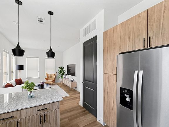 - Exterior features: *In select Units, Built-in desks and shelves*, Business Center, Contemporary 42 inch cabinets, Cozy Fire Pit, Curated On-Site Retail, Elevated Ceilings, Framed Bathroom mirror, Garden, Granite Countertops with designer backsplash, Hardwood-style flooring, Keyless door entry, Kitchen Island, Modern Kitchens with Appliance Packages, Open-Concept Floor Plans, Outdoor Kitchen with Grills, Package Receiving, Pet Spa & Paw Park, Pet-Friendly Residences, Premium Interior Finishes, Private Outdoor Space *, Private yards in all single-family homes, Putting Green, Single-basin stainless steel kitchen sink, Solar Shades, Spacious Bungalow-Style Homes with Private Yards*, Tennis Court(s), USB outlets, Walking Trails & Green Space