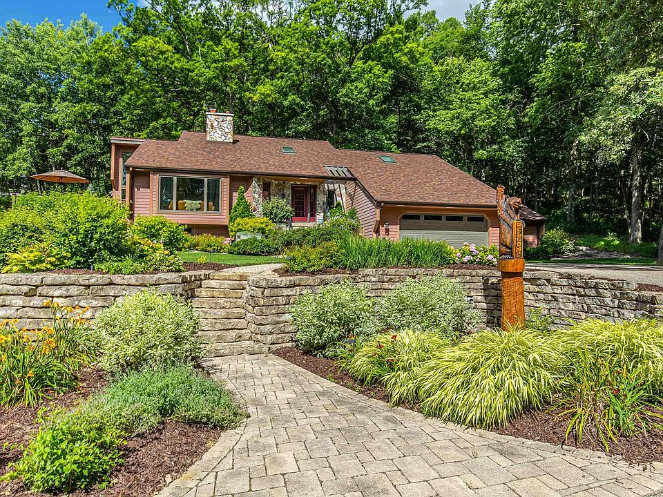 Sitting on over 6 tree filled acres, this home feels like your very own cabin in the woods! Gorgeous landscaping & brick path greet you & lead to the welcoming entry. Oversized windows & open concept offer beautiful views & great natural lighting throughout. Enjoy every time of year in the 4-season rm or cozy up next to the stunning & soaring masonry fireplace in the living rm. You will love the strategically placed built-ins & beautiful wood details at every turn. Enjoy cooking & entertaining in the kitchen w/ granite counters, wine cooler, island & breakfast bar or maintenance free deck or patio! Great bedrms & storage w/ large primary bdrm suite. Oversized 4+ car garage offers extra space for vehicles/toys. This unique property has been meticulously maintained & is ready for new owners.