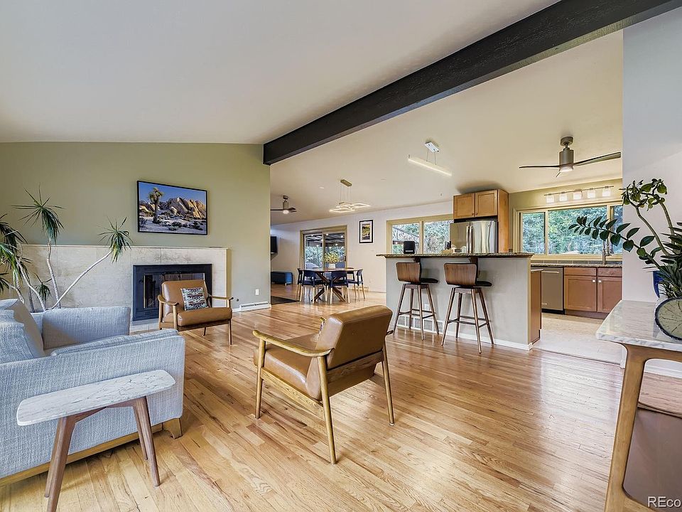 Welcome to 8100 Sunset Drive—a home that perfectly pairs modern updates with timeless mid-century character in one of Lakewood’s best-kept secret pocket neighborhoods. Upon arrival, the curb appeal shines with fresh exterior paint and mature landscaping. Enter to discover an airy open floor plan drenched in natural light from expansive windows. Vaulted ceilings accented with a stunning wood beam create an immediate sense of space, while real hardwood floors flow throughout the main level.