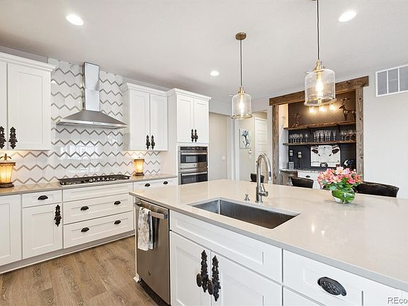 The large, eat-in kitchen is a true chef's delight featuring quartz and granite countertops, marble backsplash, stainless steel appliances, double ovens and exquisite cabinets with an amazing custom bar!