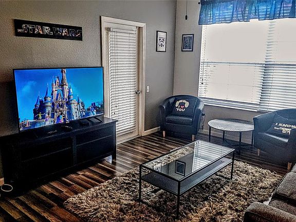 Welcome to Windsor Palms a 24-hour guard-gated resort which boasts impressive amenities offering resort style living at it's finest. This a beautiful 3 bedroom 2 bathroom, top floor condo with the largest floor plan (1402sqft). It boasts plenty of space for entertaining friends and family in the central living area which is located between bedrooms in a split design plan and has a screened in balcony. The condo has theming throughout, Star Wars, Harry Potter, Jurassic Park, Mickey/Minnie Mouse rooms The exterior of the building was freshly painted in 2025 and the roof was replaced in 2024. The resort Clubhouse features a Heated Pool and Hot Tub, Splash Pad, Playground, Tiki bar, Mini market, Movie theatre, Gym, Video arcade and Games room, Tennis courts, Basketball courts, Volleyball courts. Convenient to the Theme Park area and Orlando attractions, Restaurants, Golf and shopping. Zoned for Short and Long term rental and totally furnished.