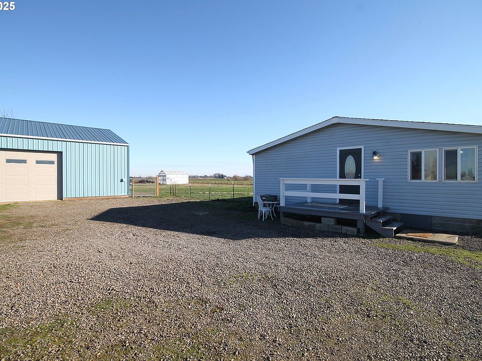 Country living on 1 acre with a view of Mount Hood in exclusive farming area. Great opportunity for country living at an affordable price with lower taxes. A fully rebuilt and remodeled 1988 manufactured home with a split face perimeter foundation, new insulation and gypsum bord, new plywood underlayment, new cabinets with granite countertops and additional windows. This 1456 sq. ft. home has 3 bedrooms, 2 full baths, engineered wood floors, ceiling fans, new interior paint and lighting fixtures. Updated kitchen features; stainless steel appliances, 5 burner gas stove with air fryer, convection, dehydration & more. Raised eating bar, new cabinets, skylight, pantry and eating nook. The kitchen is open to the large dining room and living room with vaulted ceilings and plenty of windows. The primary suite has large windows, LVL floor, ceiling fan, walk-in and linen closets, dual vanity and a built-in heated spa tub. Fantastic shop with drop down electric, built in work benches, plumbed for sink, overhead door with windows, plenty of power including 220 available, full RV hookup with power and room for more. The shop is engineered to allow solar panels on the roof and extra room in the fuse box. Gardening made easy with the stick built green house including water and power. The pump house has plenty of room for storage, updated water treatment system and wired for a full house backup generator, just add a new generator. Mature fruit trees create nice shade behind the shop for shade and privacy. A must see gem 4 miles from I-5 outside of Woodburn and the charming communities of St. Paul and Newberg. Deadline to submit offers 1/29/25 at 9:00pm.