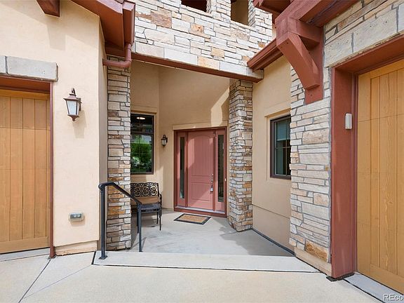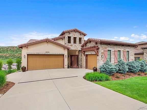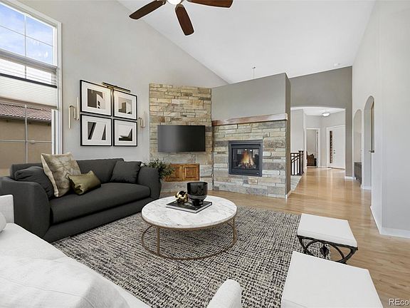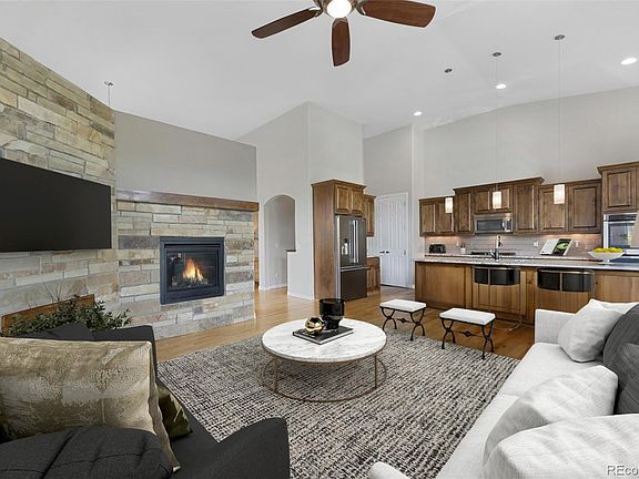 Nestled in the beautiful Ravenna Golf Course community, this ranch-style home is the perfect place to call home. Surrounded by breathtaking views of the Colorado landscape and boasting a peaceful atmosphere, this property offers the best of both worlds - luxury living and an active lifestyle. Inside, the home features an open and bright floor plan, with vaulted ceilings and large windows that let in plenty of natural light. The main floor boasts a spacious study, dining room, open family room with a butler's pantry and stunning stone fireplace, chef's kitchen, mud room, large laundry room, powder room, primary bedroom and bath. The kitchen is open and bright with a gas stovetop, oversized center island/breakfast bar, upscale appliances, and double ovens. The comfortable, walk out lower level has a cozy family room with a stone fireplace, wet bar rough-in, two additional bedrooms with walk-in closets, and a ¾ bath. The stunning outdoor area is perfect for enjoying the natural beauty of Colorado. The spacious covered deck provides the ideal spot for entertaining guests or relaxing with loved ones, no matter the weather. The patio area is perfect for grilling and enjoying meals outside, while the expansive, professionally landscaped yard provides plenty of room for outdoor activities and gardening. However, the real highlight of the outdoor areas are the surrounding mountains and lush landscapes.