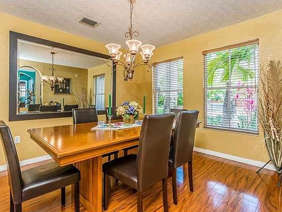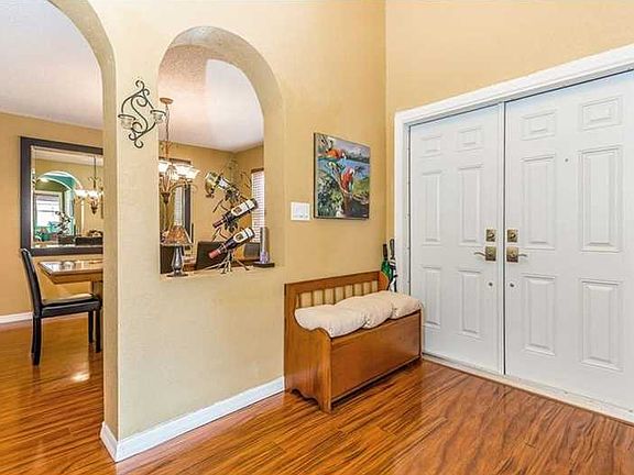 Welcome Home! to this well appointment 4 bedroom 2.5 bath home in the gated community of Poinciana at Sunset Lakes. Home has been lovingly maintained & features an oversized lot with an incredible back yard complete with a sparkling pool, tiki-hut, shed & plenty of space to grow and play. All 4 bedrooms are upstairs and feature warm wood laminate flooring throughout the second level & stairs. First level is tiled throughout with an open kitchen w/stainless steel appliances, formal living & dining areas.