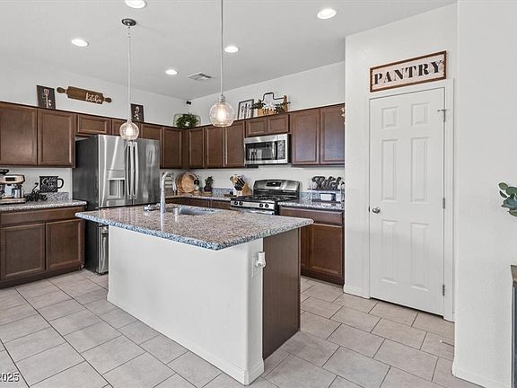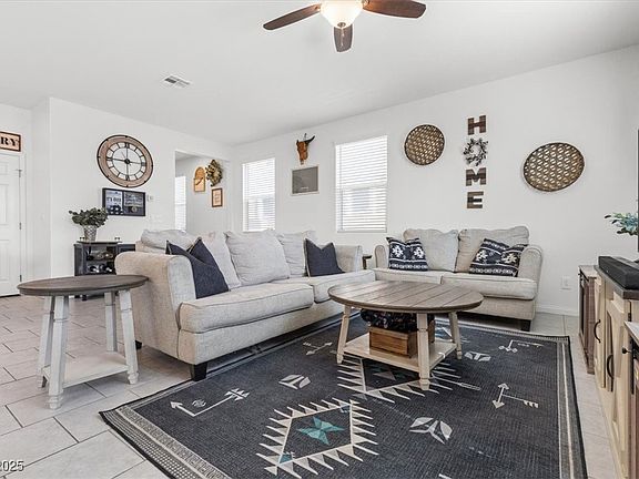 VA assumable loan at 3.875% for Veteran buyers! Ask about sellers' offer to contribute to buying down your mortgage rate/pay for a portion of your closing costs! This adorable home features an open floor plan, spacious loft, and community amenities galore! Your kitchen includes granite countertops, tons of cabinet space, and an island with additional seating. Your new home boasts a large loft for entertaining, relaxing, or separate office or play space. Step out back to your private putting green and enjoy your morning coffee with mountain views from the bedroom balcony! Discover resort-style living in community amenities including a sparkling pool, fitness center, and beautifully maintained parks, with direct access to peaceful pathways, playgrounds, and tennis/pickleball courts right outside your front door! Located in sought-after Skye Canyon, just minutes from shopping, dining, highway access for commuting. Check out the video tour & schedule a showing to see this home in person!