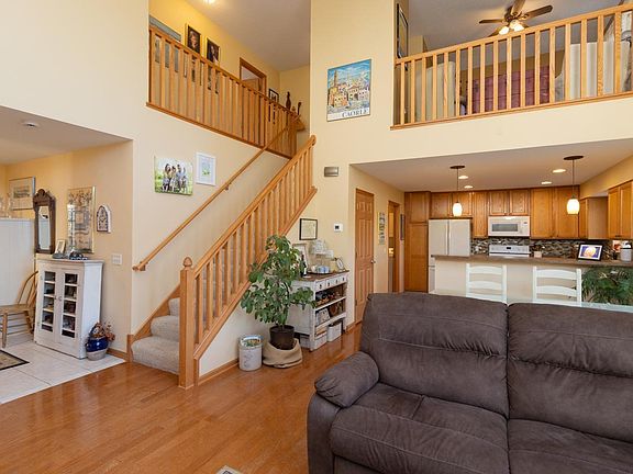 Rarely available spacious (3 level- 2 story) end unit nestled in trees and privacy in the coveted Concord Commons. Small 58 unit complex with pond and wildlife tucked into charming neighborhood. Just blocks to the Mississippi river trail and paved bike path. Meticulously maintained. Large foyer opens to dramatic 2 story living room with gas fireplace, hardwood floors, and wall of windows bringing in lots of sunlight! Open and updated kitchen, main floor laundry and 2 car garage with storage shelves. Primary bedroom has vaulted ceilings, walk in closet, and bath with dual vanities, separate soaking tub and shower. Upstairs loft overlooks living room. Second bedroom upstairs. Downstairs boasts family room, third bedroom, bathroom, and ample storage. Low association fee, maintenance free deck. New furnace, central air, water heater and gutters with rain chain. Move right in- won’t last!