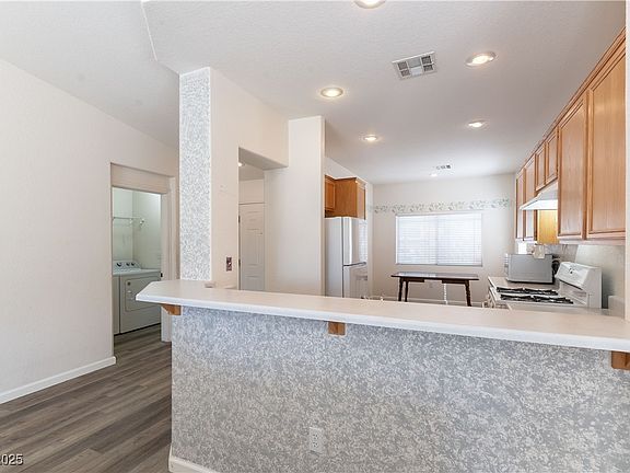 Welcome home to this beautifully landscaped 3 bedroom single story located in the heart of Centennial Hills near shops, medical, schools, & parks. Kitchen has a breakfast bar, recessed lighting, and a separate dining area. Upgraded flooring, HVAC ducting, and both bathrooms were remodeled. All the bedrooms have ceiling fans and vaulted ceilings. The owner’s suite is situated at the rear of the home, complete with a walk-in closet, wardrobe closet, and an en suite bathroom that has a low curb shower with grab bars. Entertain by the fireplace in the great room with vaulted ceiling where the slider leads out to a relaxing backyard with lush green grass.