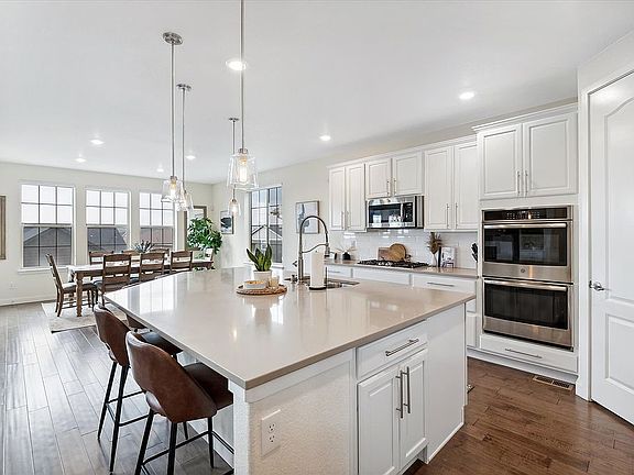 You will not want to miss this immaculate Sterling Ranch home. From the moment you enter, you will be welcomed by natural light, modern design, and elegance throughout. The main floor features an expansive kitchen, an impressive great room with vaulting ceilings, and a custom fireplace. The main floor offers a separate living, dining, or music room as you enter, a main floor office, and an additional main floor bedroom with an attached bathroom. The upper floor features an impressive primary suite large walk-in closet, a large shower, a soaking tub, and double vanities. Two additional bedrooms with a Jack and Jill bathroom and a large open loft and laundry area complete the upstairs. The fully finished walk-out basement offers another bedroom with an attached bath featuring a large custom shower, a gracious entertainment room with a wet bar, and an additional non-conforming bedroom or study. Enjoy plenty of parking with 3 garage spaces. Every upgrade is included in this home including the incredible covered deck and lower patio from the walk-out basement. The low-maintenance backyard offers a large turf area and beautiful landscaping.