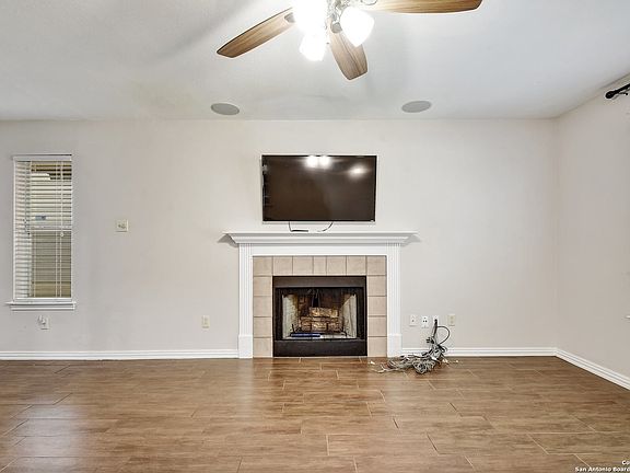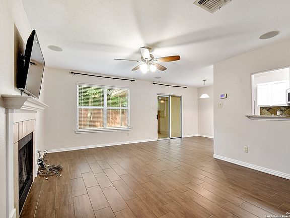 Beautifully updated townhome nestled in the quaint gated community of The Village at Rustic Oaks. Featuring granite counters in the kitchen and bathrooms, two bedrooms with en-suite facilities, stainless steel appliances, wood-burning fireplace, covered patio, oversized walk-in closets and pantry, surround sound wiring, speakers and more! The third bedroom downstairs can be used as a study/office or personal gym. Easy access to UTSA, USAA, the Medical Center, and all your essential needs.