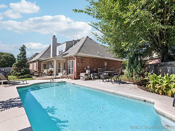 Incredible opportunity in one of South Tulsa’s most desirable communities in Union Schools—The Crescent. This beautifully maintained home sits on a semi-cul-de-sac lot backing to a peaceful greenbelt and neighborhood trails, offering rare privacy and scenic views. The backyard is a true outdoor oasis with a sparkling pool, large pool deck, and a covered porch ideal for relaxing & entertaining. Inside, the vaulted kitchen features open-beamed ceilings, a breakfast nook, and flows into the cozy family room with a stacked-stone fireplace. A formal dining room connects to the kitchen, and a dedicated home office with french doors is located off the entry. The spacious primary suite offers direct access to the pool and patio, along with a large en-suite bath featuring a jetted tub, separate shower, double sinks, and a linen closet. A second downstairs bedroom (or optional office) is tucked away down the same hall with a full guest bath nearby. Upstairs, two generous bedrooms share a Jack-and-Jill bathroom, and a large game room over the garage includes a built-in desk and dry bar—perfect for entertaining, movie nights, or a home gym. Lovingly cared for and move-in ready, this home also includes a transferable home warranty for added peace of mind. Don't miss your chance to live in one of South Tulsa’s most sought-after neighborhoods with greenbelt access right out your back gate! Neighborhood trails, ponds & catch & release fishing - access to the trails is just a step outside your back yard. Welcome Home!