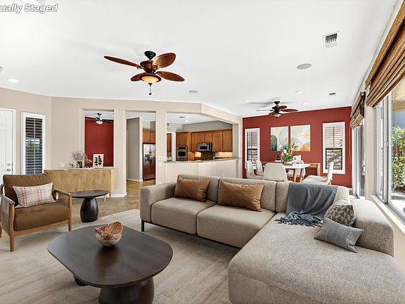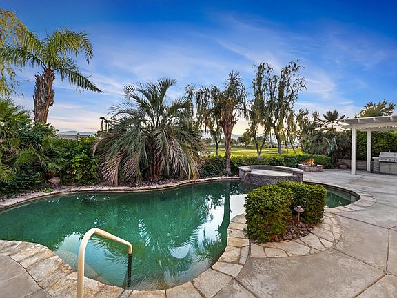 Welcome to resort-style living in Sun City Shadow Hills, one of the desert's premier 55+ active adult communities. This beautifully upgraded Sorrano floor plan offers 2,115 sq. ft. (EST.) of well-designed living space featuring 3 bedrooms (including a private casita), 3 bathrooms, and a separate den--perfect for an office, library, or hobby room. Situated on a premium southern-exposure golf course lot overlooking the 9th hole of the South Course, this home delivers breathtaking views of the golf course, sparkling lake, and surrounding mountains. Step outside and enjoy your own private paradise complete with a custom pool, elevated spa, and cozy fire pit--the ideal setting for morning coffee, sunset lounging, and year-round entertaining. Inside, the open-concept great room showcases tile flooring, a built-in media cabinet, elegant shutters and custom window treatments, and designer interior paint. The kitchen offers both style and functionality with granite slab countertops, stainless steel appliances, double ovens, a center island, breakfast bar, and a welcoming breakfast nook that overlooks the backyard oasis. The spacious primary suite enjoys serene views of the backyard and features an ensuite bathroom with dual vanities, a soaking tub, a separate shower, and a large walk-in closet. The guest bedroom in the main house has a full bathroom conveniently located nearby, providing comfort and flexibility for visitors. The detached casita offers wonderful privacy with a double-door entry, tile flooring, and its own ensuite bathroom--ideal for guests or extended family. A sliding door off the dining area seamlessly connects indoor and outdoor living, leading to a covered patio shaded by an Alumawood pergola and a built-in barbecue station--perfect for hosting friends and family. With its incredible lot, spacious layout, private casita, and resort-worthy outdoor amenities, this home embodies the best of desert living. Don't miss your opportunity to own one of the most desirable properties in Sun City Shadow Hills! Enjoy championship golf, two clubhouses, state-of-the-art fitness centers, indoor and outdoor pools, tennis and pickleball courts, dog parks, and more than 60 active clubs. Whether your passion is art, music, sports, or community, you will find your rhythm here at Sun city Shadow Hills!